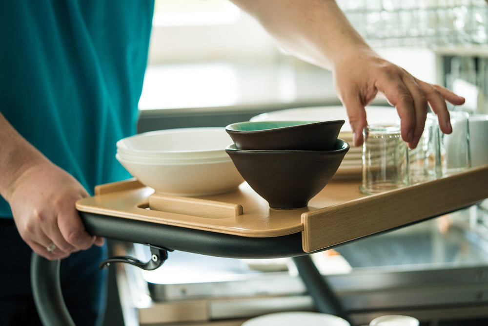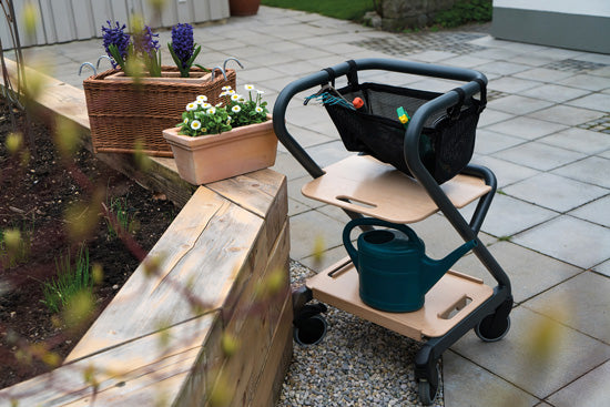 Passend zu dem Saljol Wohnraumrollator kann das dunkle Tablett aus Echtholz bestellt werden. Es wird einfach auf den Rahmen aufgelegt und dient zum Transport von Speisen und Getränken. Somit hat der Nutzer die Hände frei, um sich sicher abzustützen. Das abnehmbare Tablett ist aus Echtholz gefertigt.