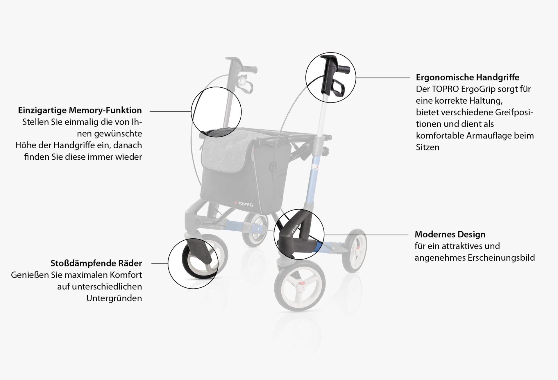 Der neu gestaltete Rahmen wirkt nicht nur schlanker und moderner, sondern sorgt gemeinsam mit den überarbeiteten Rädern für die von TOPRO bekannte Stabilität und Stoßdämpfung. Die ergonomischen Handgriffe (TOPRO Ergo Grip) bieten flexible Greifmöglichkeiten, fördern eine gesunde Haltung beim Gehen und dienen beim Pausieren als komfortable Armlehnen.